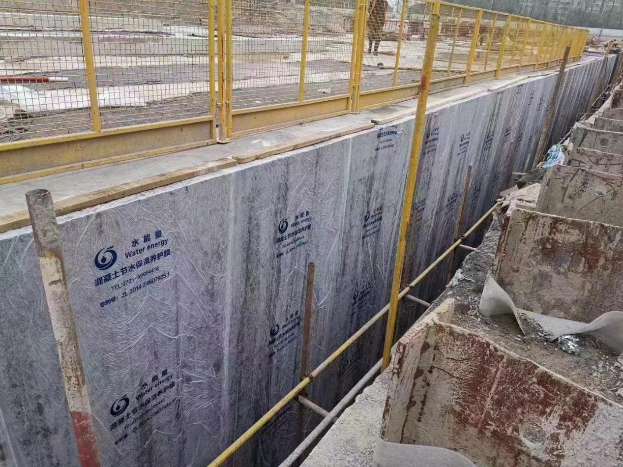 混凝土節水保濕養護膜,是以新型可控高分子吸水材料為核心,以塑料薄膜為載體,通過設備加工復合而成的卷材產品。其中高分子材料可吸收自重200倍的水分子, 吸水膨脹后變成透明的晶狀體,把液態水變成固態水,每平方米養護膜可蓄水0.5KG,成為一個固態的微型水庫,然后通過毛細管的作用向混凝土養護面滲透, 同時不斷吸收混凝土在水化過程中產生的蒸發水,因此在一個養護期內總能保持混凝土表面濕潤。
